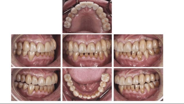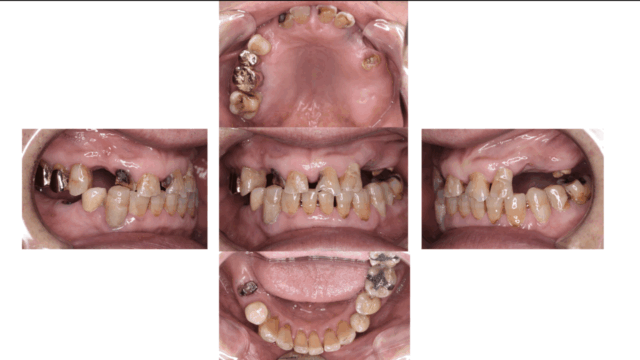 | 処置内容 | 臼歯部欠損による咬合高径の低下に対する咬合挙上を伴う咬合再構成 右上3 左下5.6 インプラント 左上3.4.5.6 インプラントブリッジ 左上1256 右上123 右下34 左下56 オールセラミッククラウン 左下6セラミックインレー 左上:サイナスリフト |